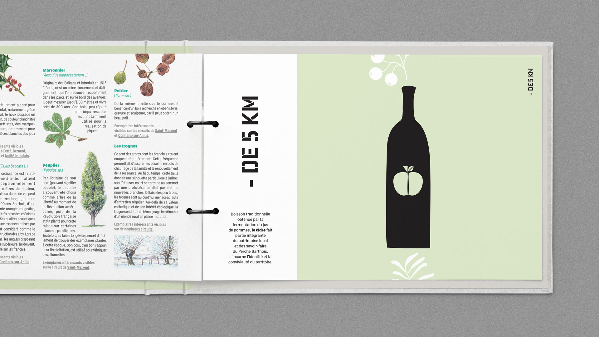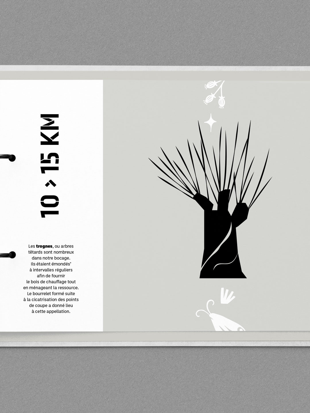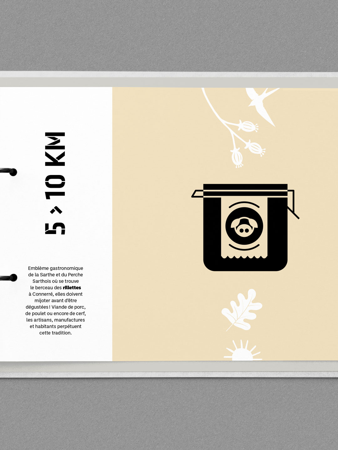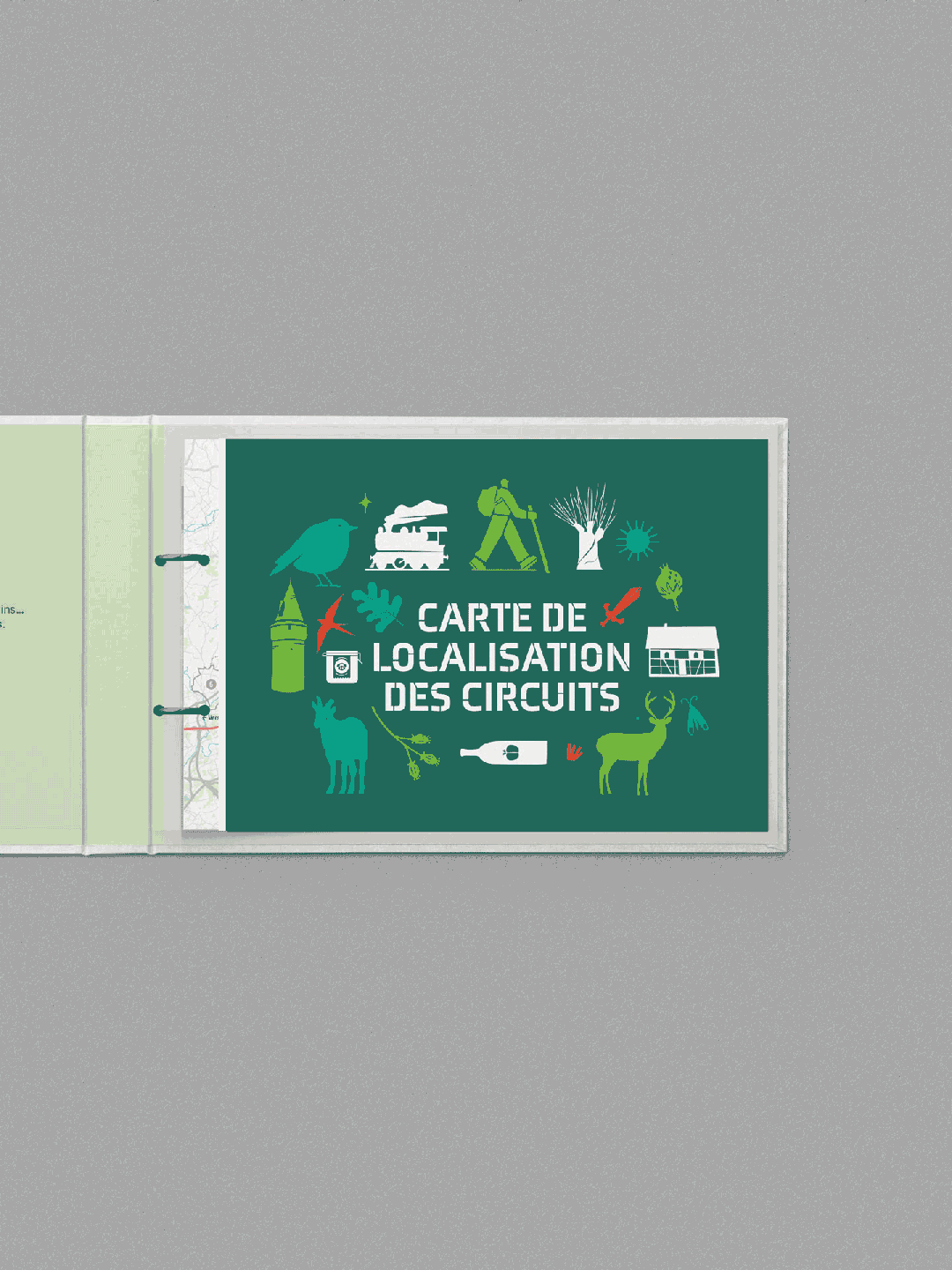 Marcher, guider, raconter un territoire — ce projet m’a conduit au cœur du Perche Sarthois, pour repenser le guide de randonnée du territoire et en faire un véritable outil d’orientation et de découverte. Conçu sous la forme d’un classeur, il rassemble 50 circuits sélectionnés et évalués avec le Comité Départemental de Randonnée Pédestre : un objet pensé pour le terrain, manipulable, durable et évolutif.